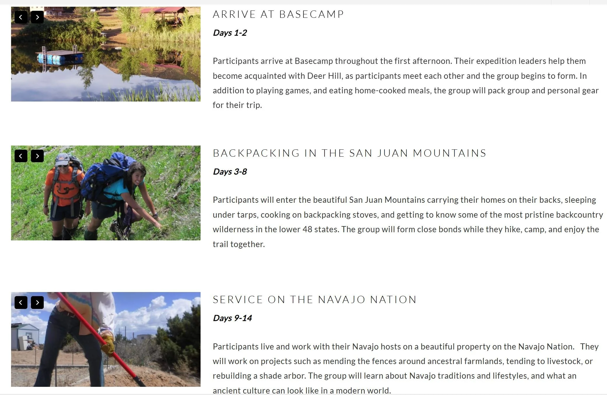 Start at Basecamp then depart for the Gravel Canyon trailhead for canyoneering, where you will rappel, backpack, and rope as needed through the sinuous sandstone and cave like vaults. Next, you’ll get to participate in mountain backpacking and mountaineering as you traverse snowfields, summit 13- and 14,000 foot peaks and learn orienteering and Leave No Trace principles. Finally, you will head to Zuni Pueblo to live and work on a number of community service projects (gain 32 service hours with this Deer Hill program) before returning to Basecamp.